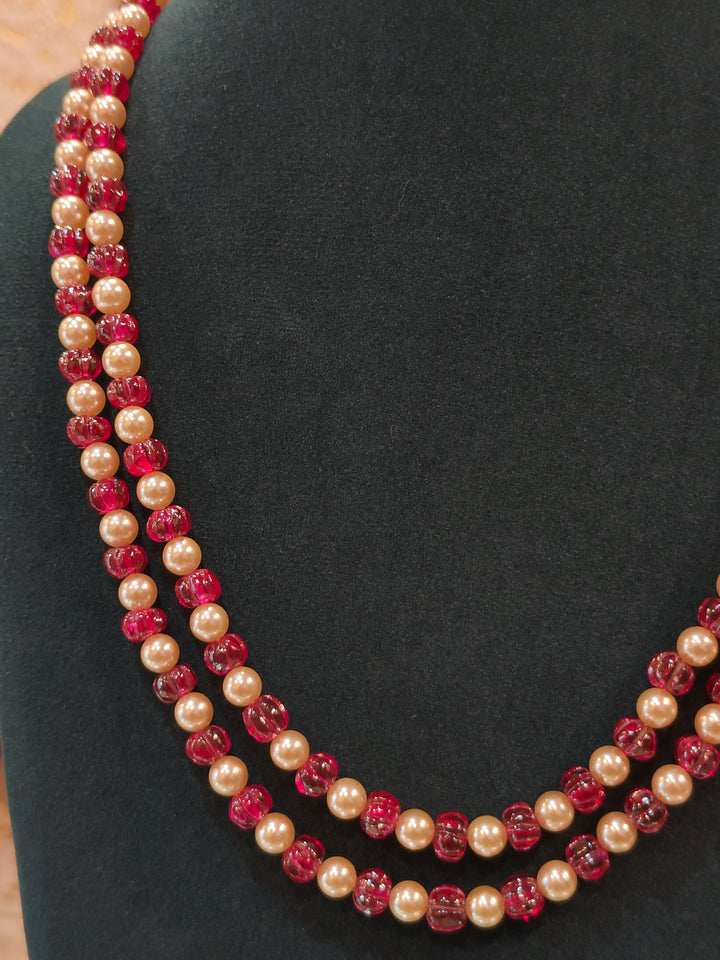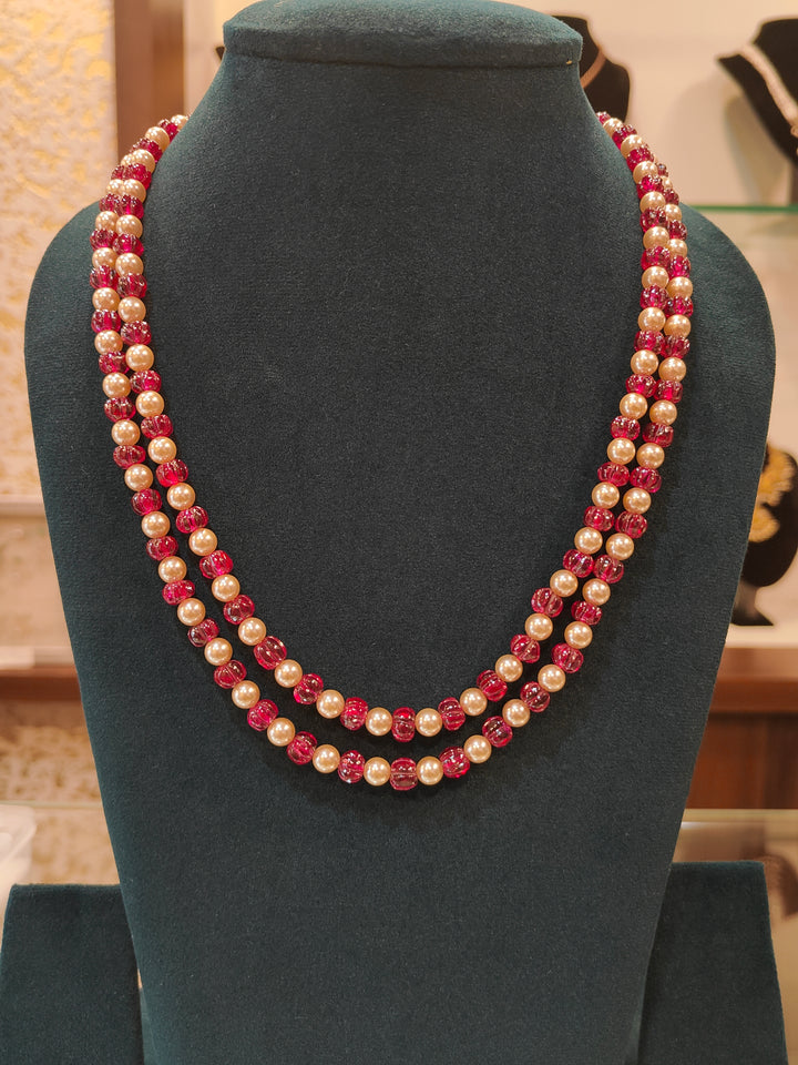 Add a refined touch to your collection with this elegant two-line necklace, featuring vibrant ruby Tarbuja beads beautifully accented with Swarovski pearls in between. This handcrafted piece is perfect for festive occasions, weddings, or adding sophistication to everyday wear.