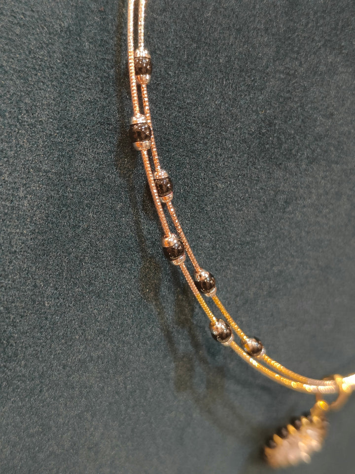 This 92.5 silver two-line blossom kante blends classic charm with a touch of contemporary sparkle. The design features two neatly arranged silver lines adorned with rich black beads, creating a bold contrast that highlights the polished finish of the kante. Each line carries a mix of gold, rhodium, and rosegold–polished accents, giving the necklace a versatile, multi-tone glow that pairs easily with different outfits and occasions.