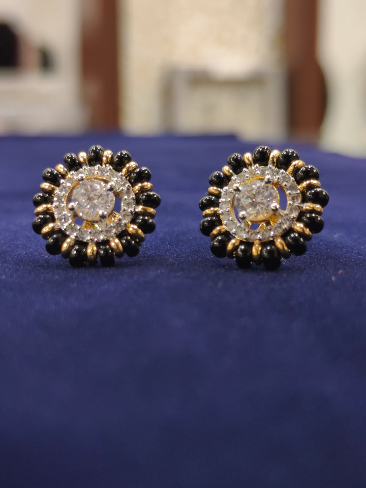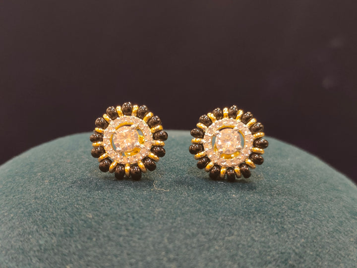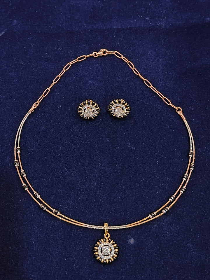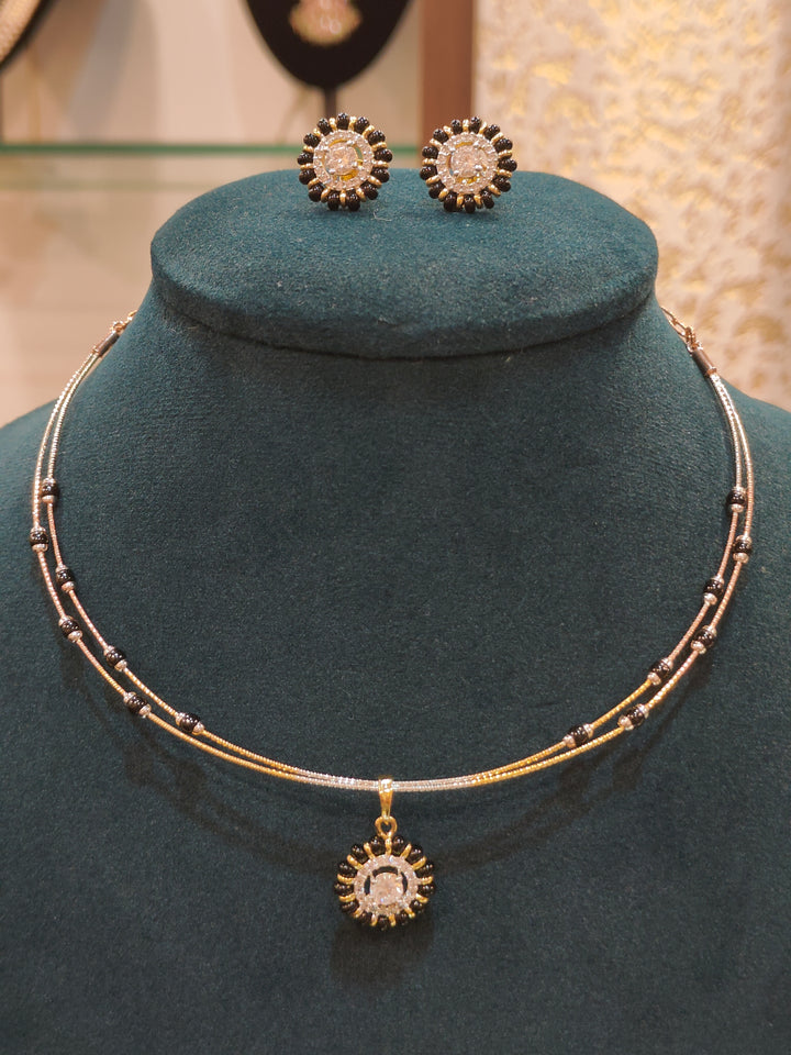 At the center rests a round pendant surrounded with black beads and shimmering CZ stones, adding a refined brightness to the deeper tones of the design. The matching earrings mirror this style, creating a complete, balanced set that frames the face with a gentle sparkle. The black beads lend a traditional, graceful mood, while the CZ stones bring a contemporary lift, making the piece suitable for both everyday elegance and special events.