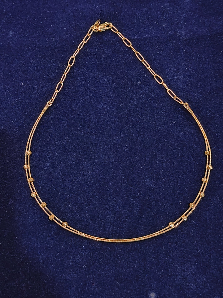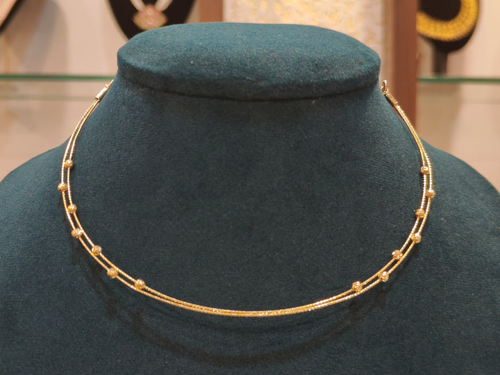 This 92.5 silver two-line blossom kante brings a warm, traditional glow to the neckline with its simple yet elegant design. The two silver strands are arranged neatly and adorned with round gold-polished balls that add a soft, radiant contrast to the cool silver base. The gold detailing gives the piece a gentle festive shimmer, making it versatile for both everyday ethnic wear and special occasions.
