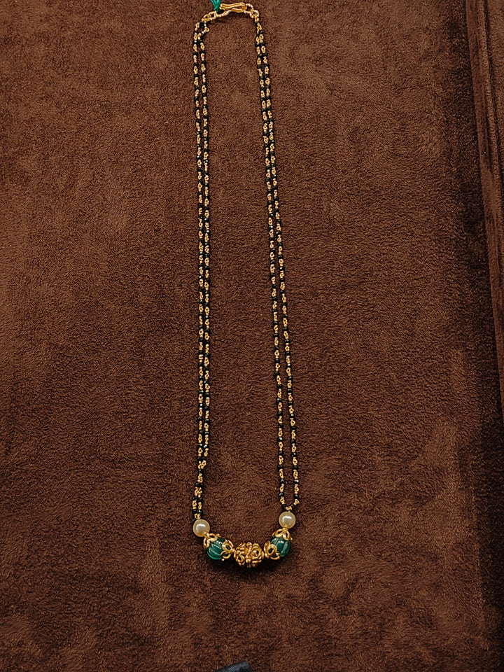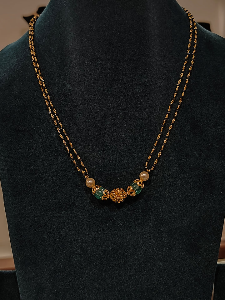 Add a traditional yet elegant touch to your jewellery collection with this black beads necklace featuring a beautiful combination of 92.5 silver round nakshi balls, Swarovski pearls, and green beads with caps, all attached to two lines of crystal black beads tharmala. Perfect for festive occasions and cultural celebrations, this necklace blends classic design with modern charm.