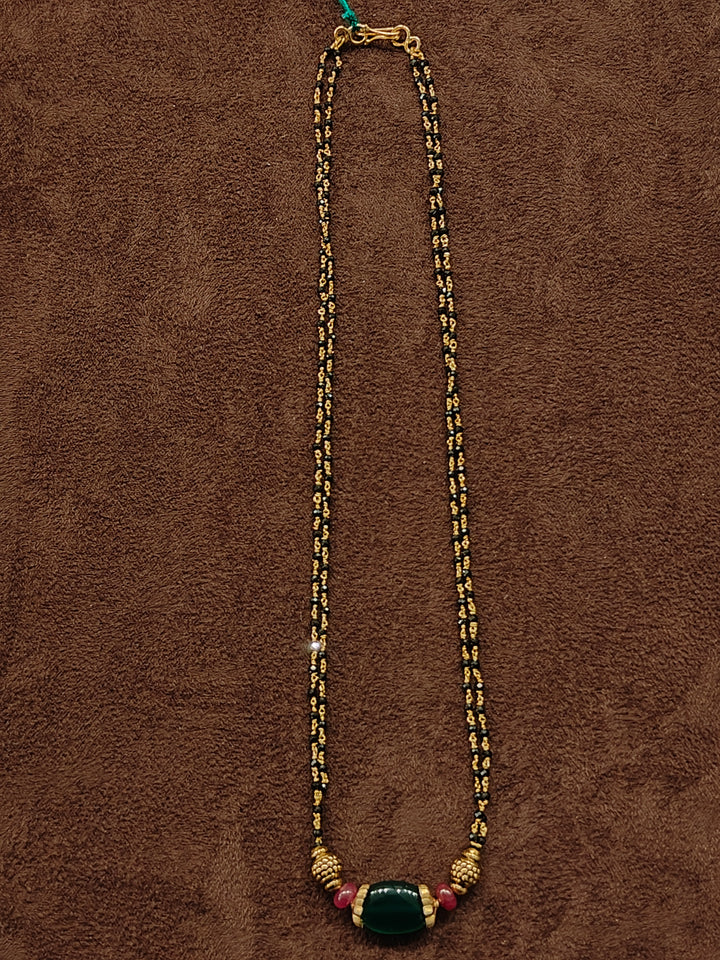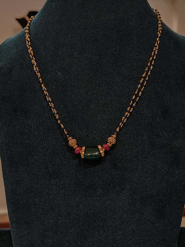 Bring a traditional yet stylish touch to your look with this black beads necklace featuring two 92.5 silver nakshi balls, a combination of big green beads with caps and two ruby beads, beautifully attached to two lines of crystal black beads tharmala. Perfect for weddings and festive occasions, this necklace blends elegance with ethnic charm.
