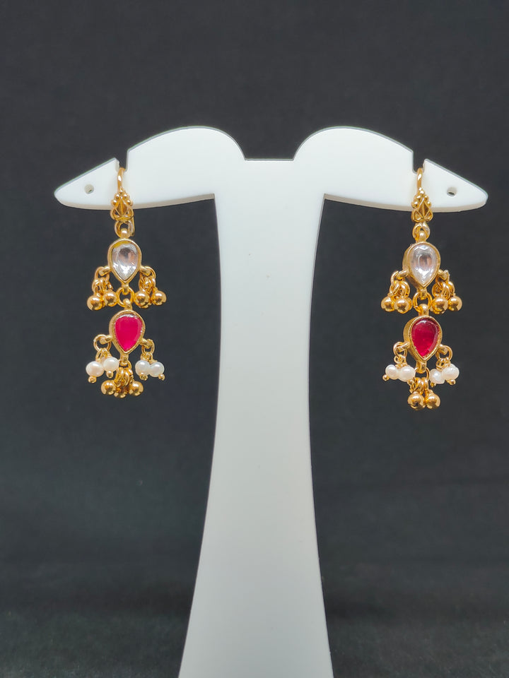 Design: Oval-shaped Kundan hangings with gold-plated ball details and pearl drops
