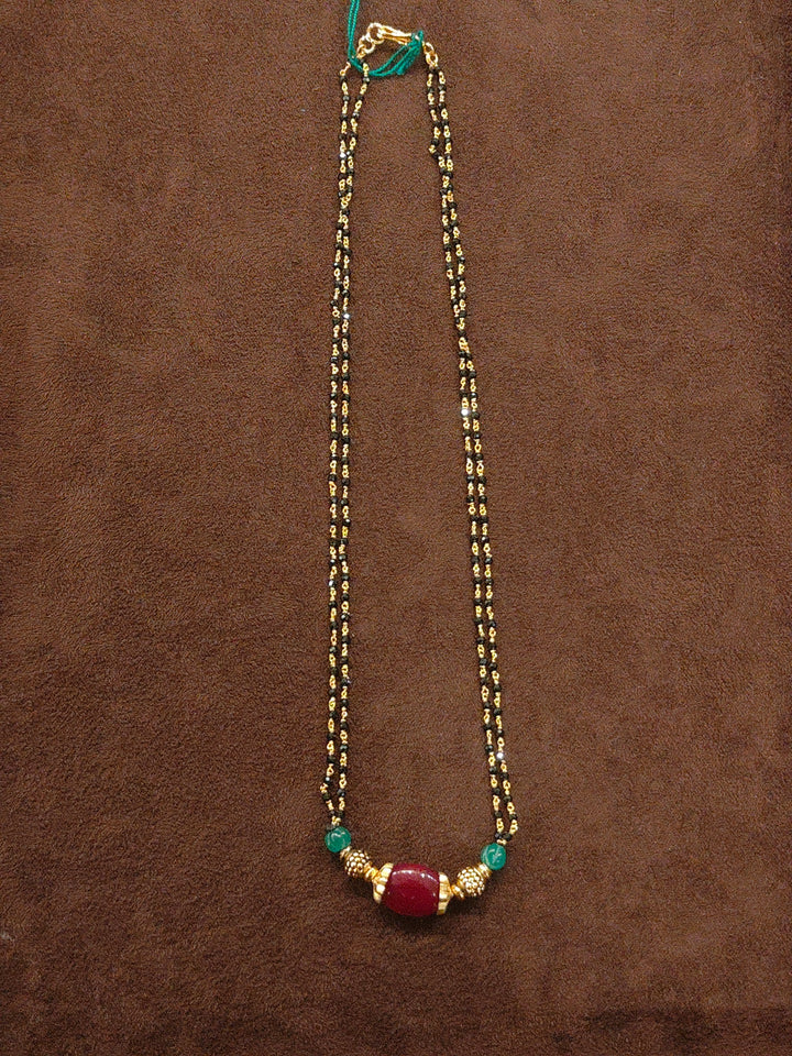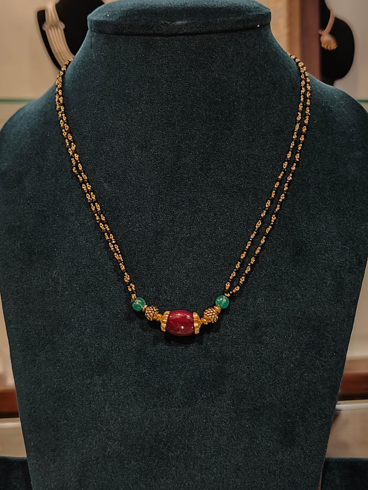 Enhance your traditional look with this elegant black beads necklace featuring two 92.5 silver nakshi balls, a combination of green beads and big ruby beads with caps, beautifully attached to two lines of crystal black beads tharmala. A perfect accessory for festive occasions, this necklace blends classic charm with graceful design.