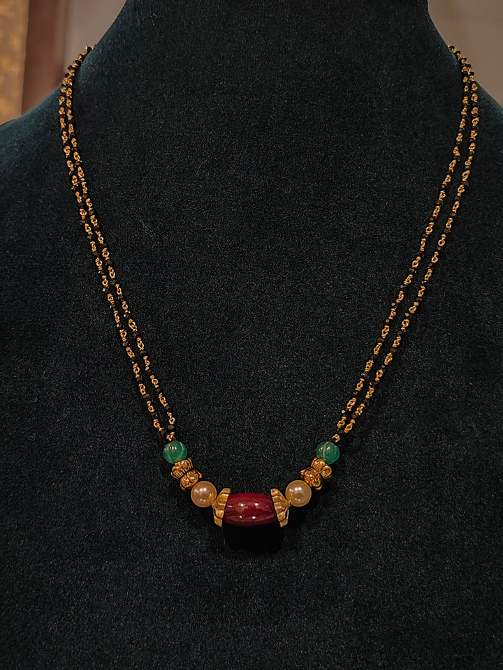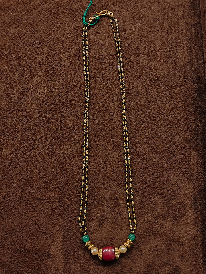 Add elegance and tradition to your jewellery collection with this black beads necklace featuring two 92.5 silver flower balls, a stunning mix of green beads, Swarovski pearls, and big ruby beads with caps, beautifully strung on two lines of crystal black beads tharmala. Perfect for festive occasions and cultural celebrations, this necklace blends classic craftsmanship with graceful design.